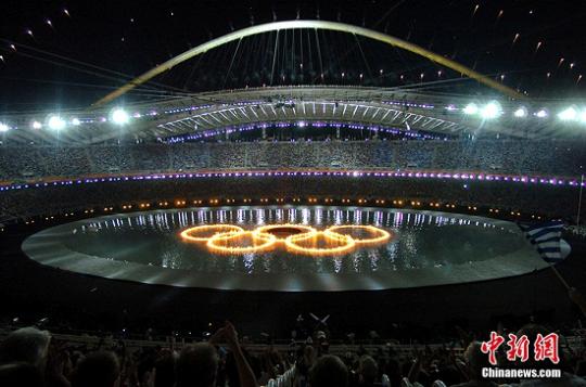 场地中央巨大的奥运五环。希腊演员以如诗如梦般的表演展示了爱琴海的浪漫和古代希腊的文明