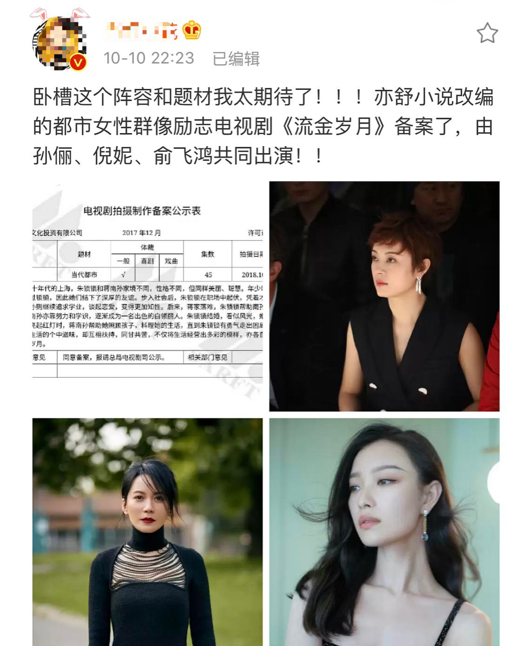这部电视剧的备案相关信息也已经公示,也有营销号发布孙俪、倪妮、俞飞鸿三大女神合体主演亦舒剧作的消息。