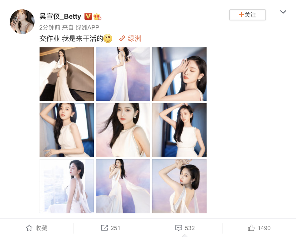 1月7日,吴宣仪在绿洲晒出一组自己的美照,说道:“交作业,我是来干活的”。照片中她妆容精致,手上的钻戒和耳朵上的钻石耳饰相呼应,气质十分优雅。她身穿白色钻边露背长裙,秀美背和好身材,身后两根长飘带走起路来仙气飘飘。
