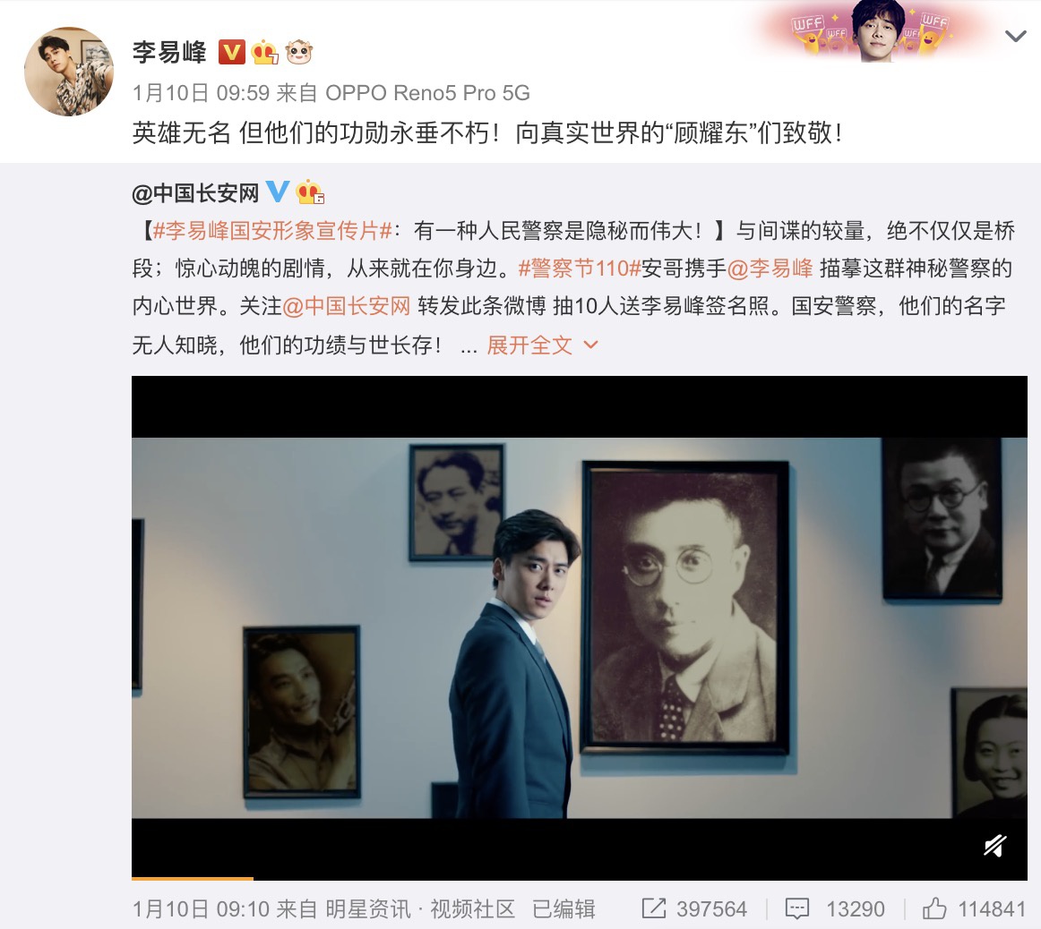 1月10日,在首个中国人民警察节,国家安全部首支形象片重磅上线,演员李易峰作为宣传大使在片中倾情出演。向所有战斗在国家安全战线上的忠诚卫士致敬,向所有人民警察致敬。