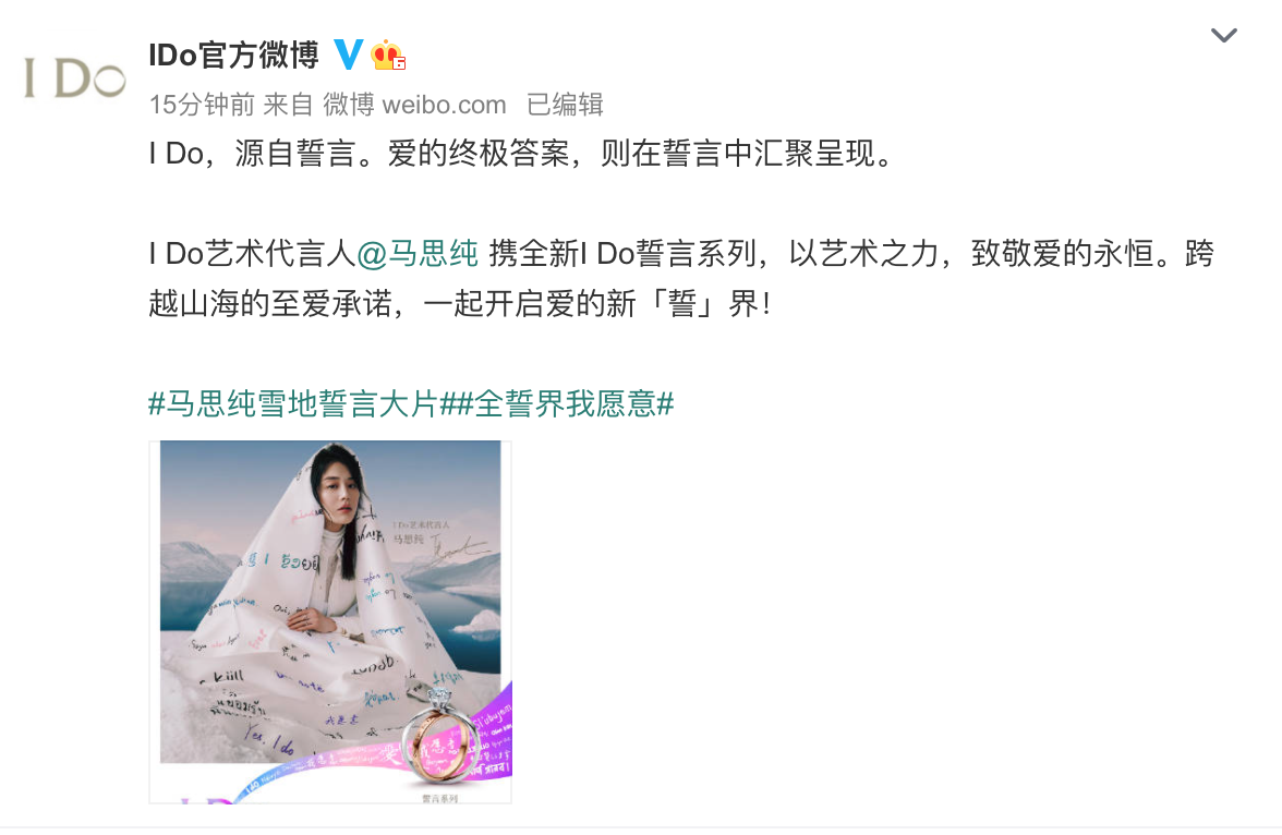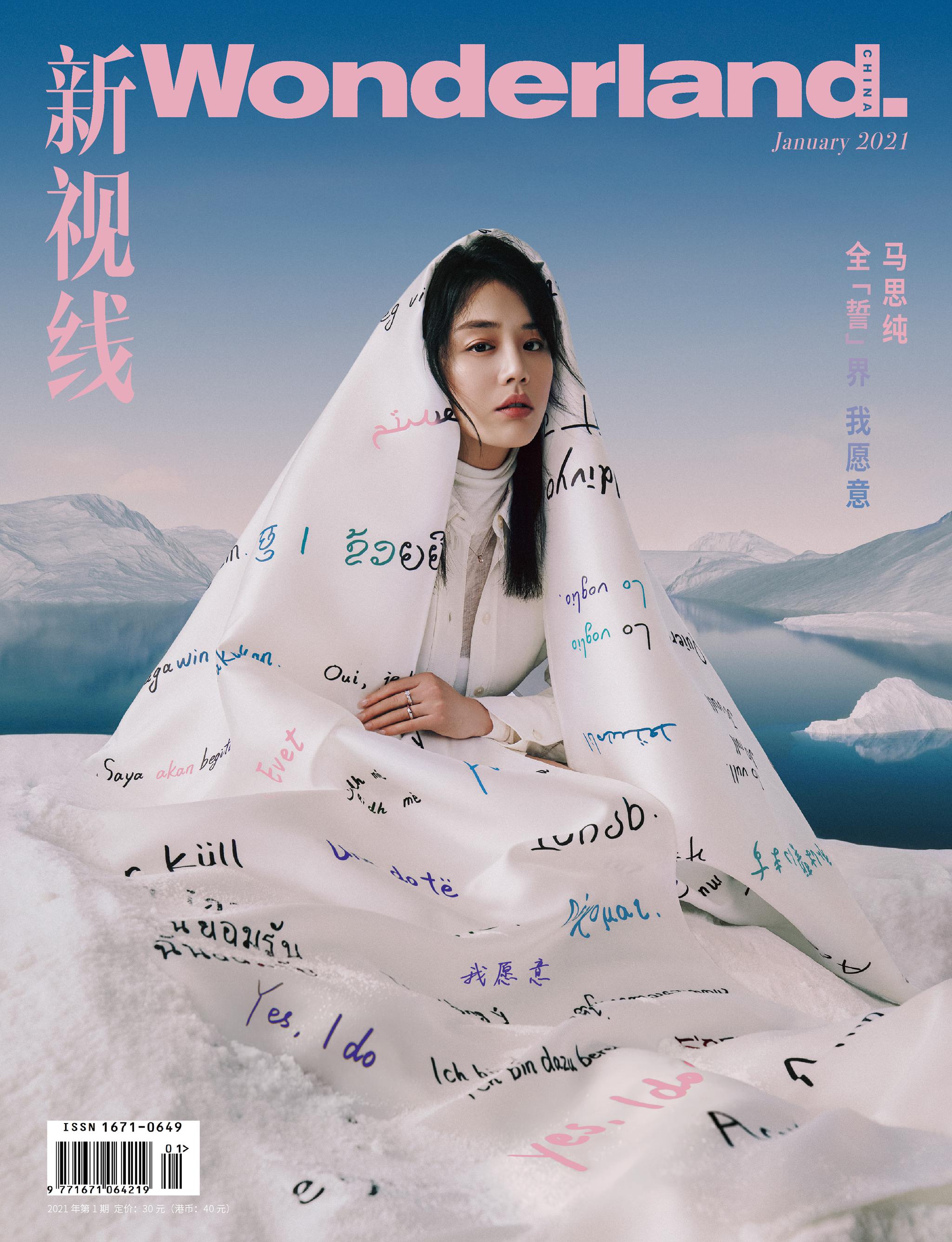 近日某杂志开年封面上,马思纯以誓言裹身独特造型亮相。前期马思纯更是深夜,在社交媒体上po出在雪山写“爱”,引发大众种种猜测。 久未有作品面世的马思纯,一直在筹备大荧幕佳作,今年更是有与彭于晏、王俊凯等实力人气男星合作的影视作品即将上映,颇有爆款之相。而更多网友除了惊呼杂志艺术气质,坐等新作之外,更是关心影后的情感生活 马思纯如画面冰雪中向往光明,勇于面对不完美的自己。在雪地写爱,更有细心网友发现马思纯的爱很特别,似乎暗示自己心里变化,身处娱乐圈依然守护“爱没有勾心斗角”。回想起近期娱乐圈众多情侣的聚散离合,想必马思纯一如初见,遵从内心如初恋般美好。 释出的这组大片中,马思纯身上披的白色印花丝巾十分引人注目,据悉,这条丝巾是以“誓言”为主题而特别设计的,白色丝巾上绣着280种语言的“我愿意”,细节感十足,特别又精致。马思纯参与某珠宝品牌艺术创作,远赴雪山指间该珠宝品牌新品戒指格外吸睛,时髦感up! 杂志上线当日,该珠宝品牌即官宣马思纯“艺术代言人“身份,看来这位曾凭借《七月与安生》拿下金马影后的小花,不管是在大荧幕、时尚质感还是商业价值上,都已经占据有一席之地,名利双收。再加上后续待播佳作,真是让大家对2021年的马思纯充满期待。