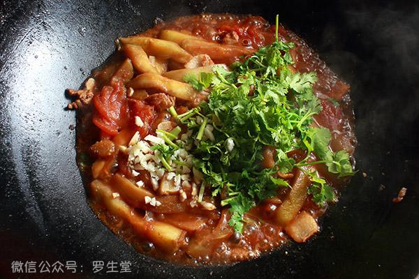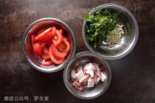 西红柿去皮切片,香菜切小段,蒜切末,肉切片备用