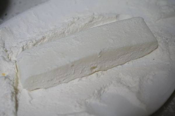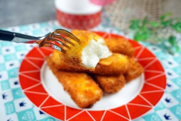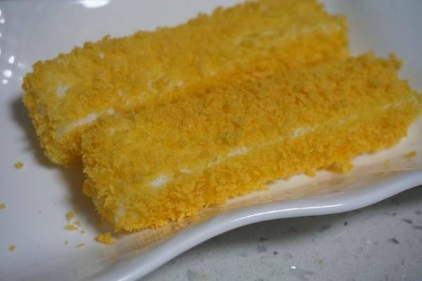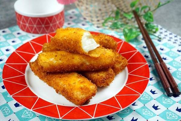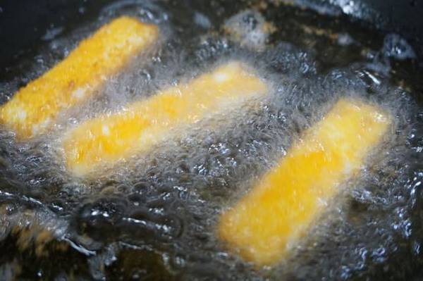 7、油烧到六成热,放入奶糕条,炸到金黄即可。