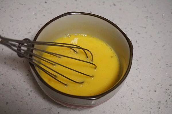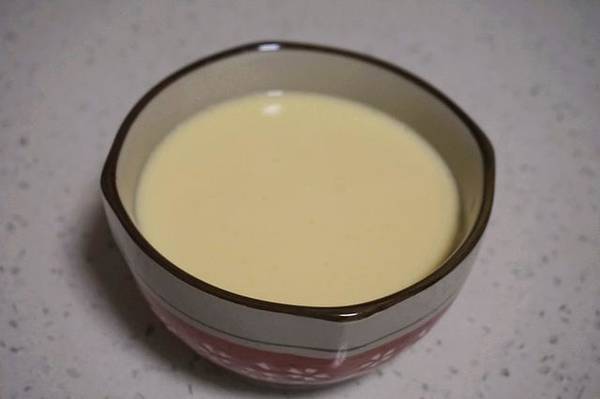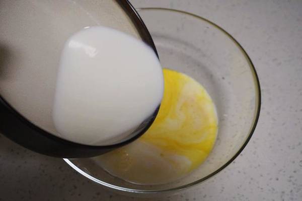 4、牛奶倒入到蛋液中,稍微搅拌,等2分钟,待两种液体充分融合。