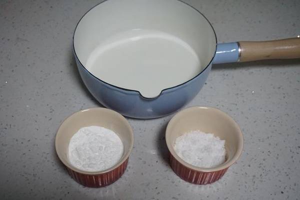 1、准备好需要的食材,其实就是一袋牛奶,一勺砂糖,2勺左右的淀粉。