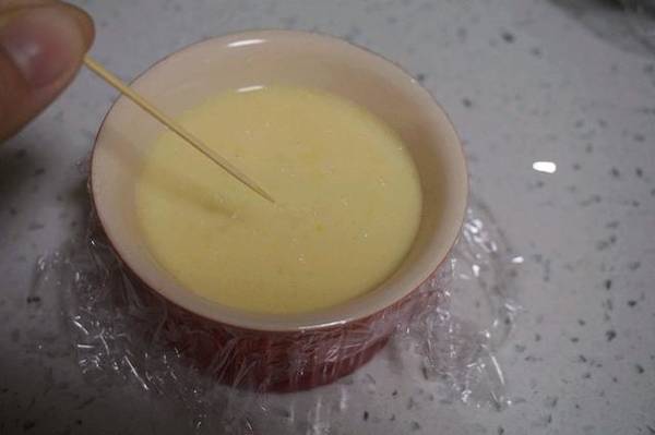 覆盖保鲜膜,是为了锁住水分,扎孔是为了让蒸汽循环流动,如此蒸出来的蛋羹细腻无气泡,嫩滑香甜。