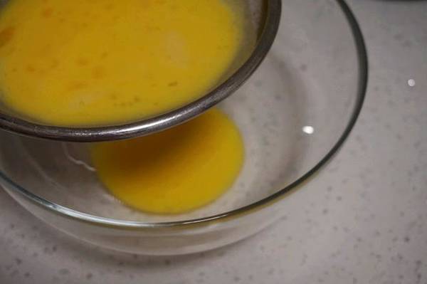 3、蛋液进行首次过筛。这是制作的窍门一,过滤掉蛋丝和泡沫,蛋液表面可以保持光滑平整,不会有难看的蜂窝状。