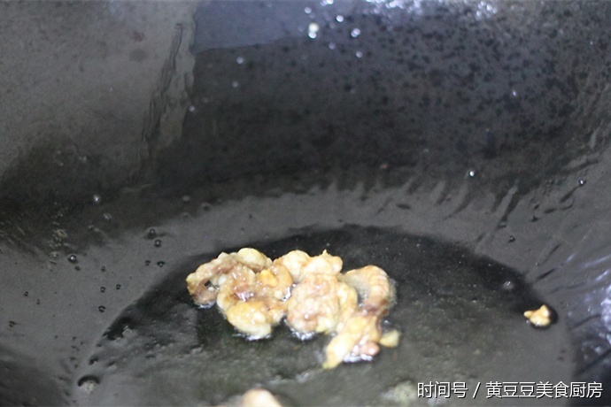 6、等鸡油全部煸炒出来后放入焯过水的鸡肉一炒翻炒