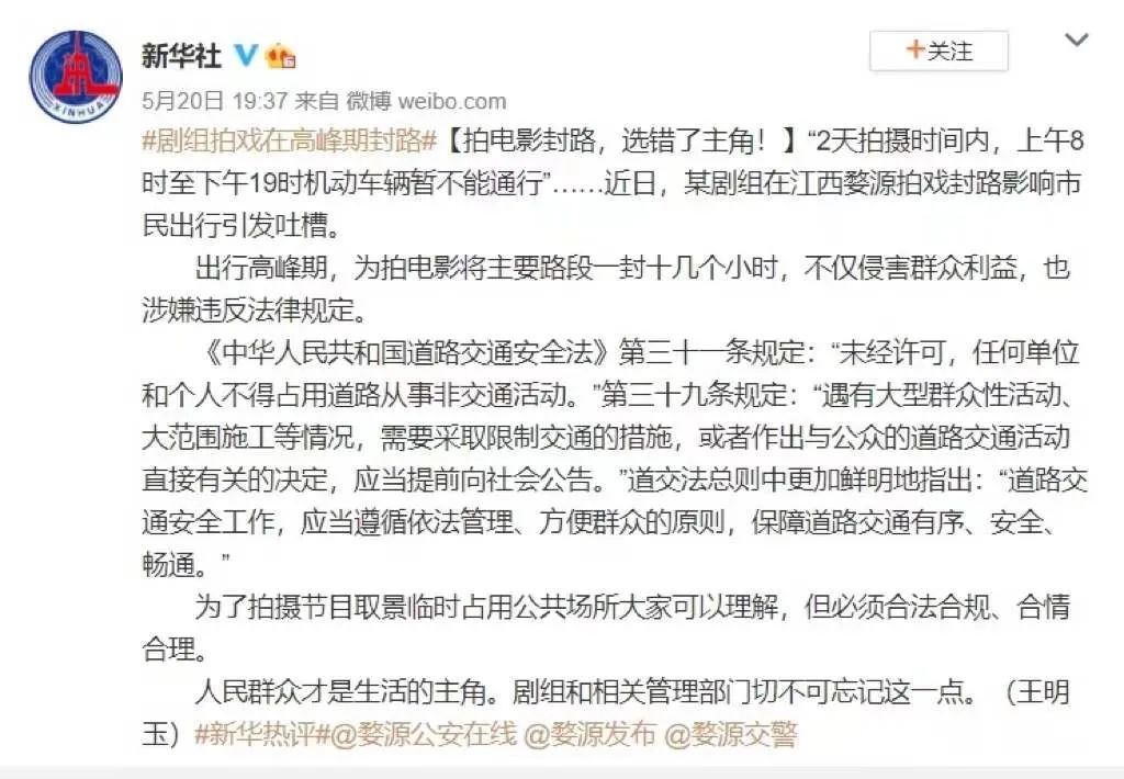 张国立、范伟、周冬雨主演的《朝云暮雨》剧组长时间封锁路段,影响家长接送小孩,干扰群众正常出行。