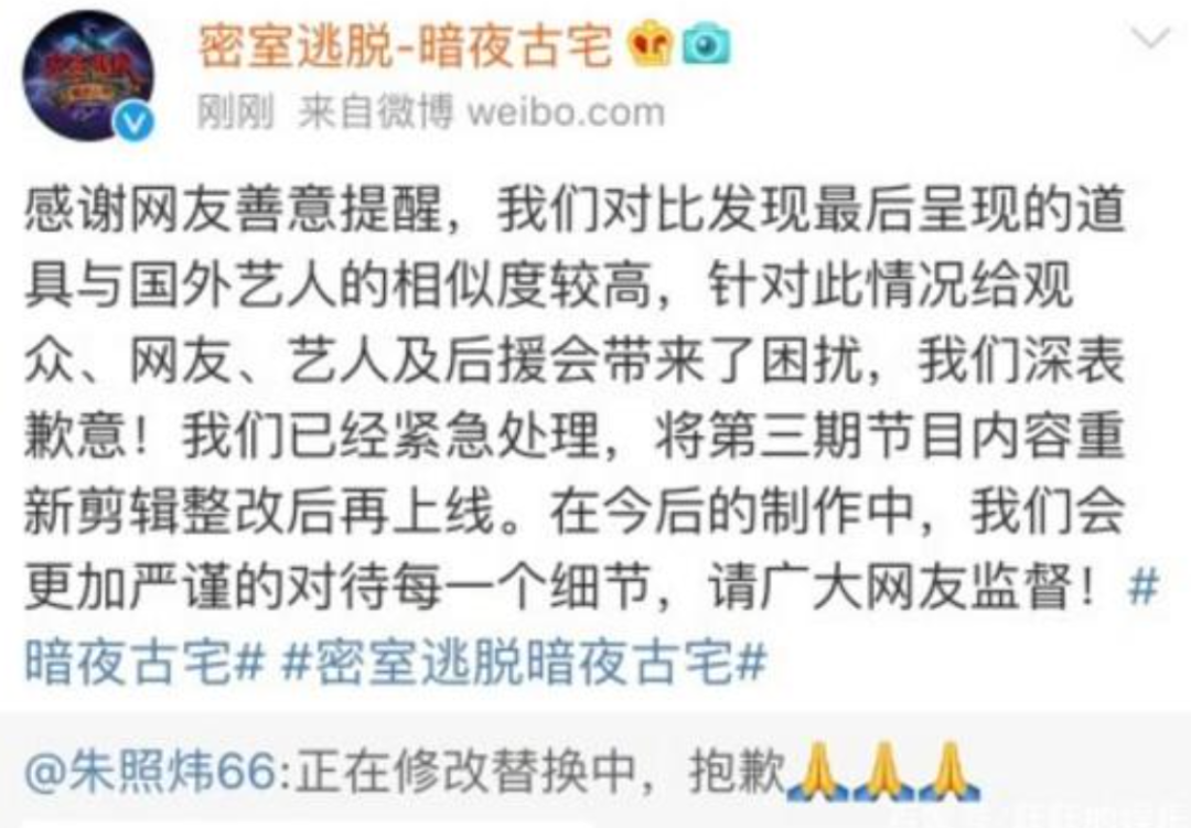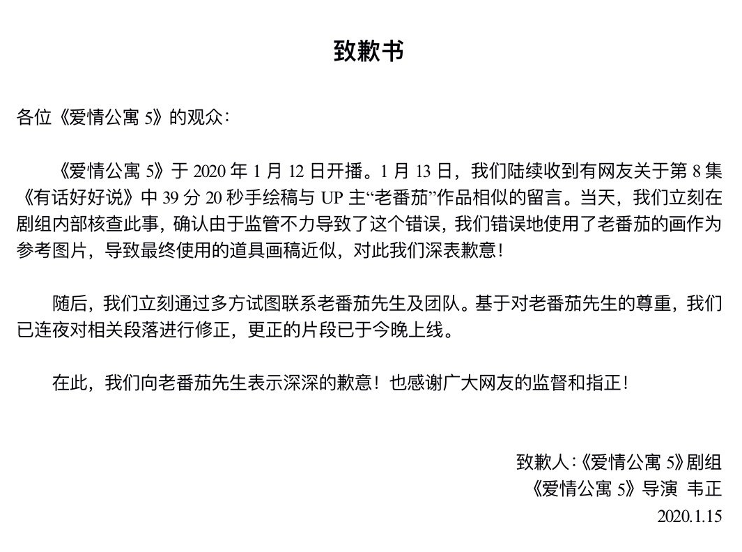 不过,制作方很快发出致歉函,并与原作者积极协商、沟通解决方案,最终获得谅解。