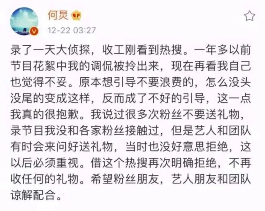 何炅解释为何收粉丝昂贵礼物,并承诺再也不会有此类情况出现。