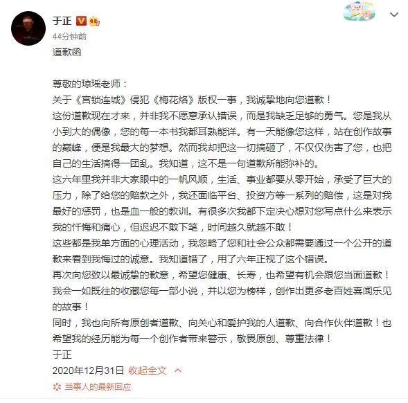 时隔几年,直到2020年年末,琼瑶才收到了于正的正式道歉。