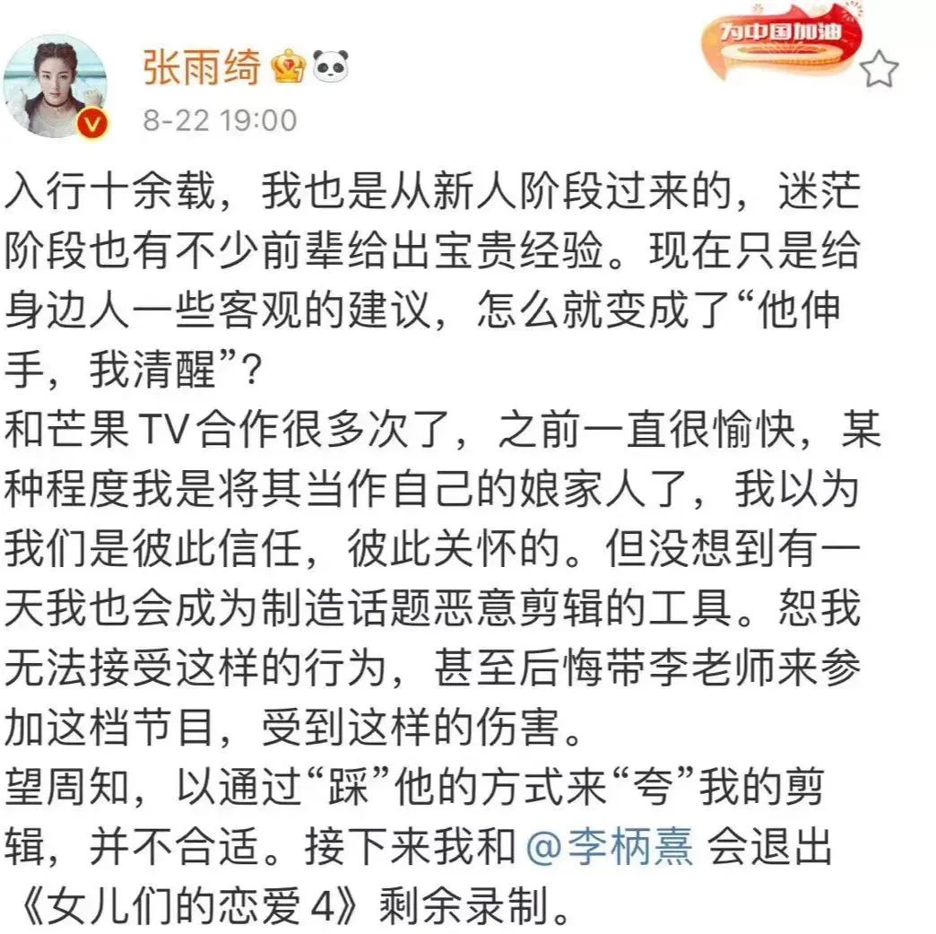 虽然8月份张雨绮发文为男友站台,因芒果台恶意剪辑给男友造成伤害,最后决定退出节目录制。
