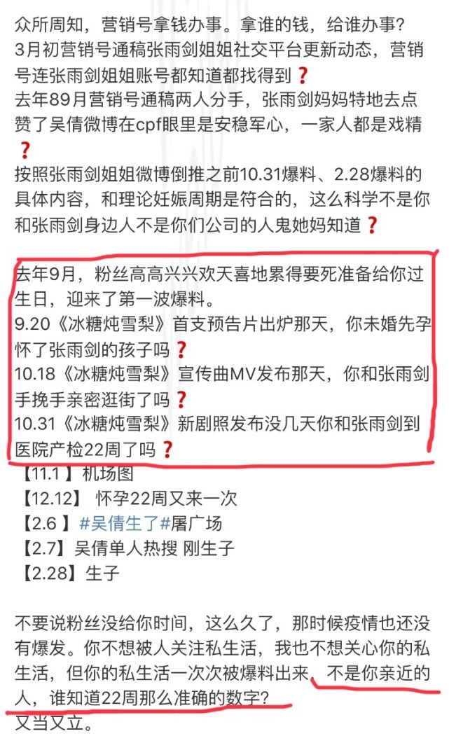 2020年《冰糖炖雪梨》上线,这是吴倩第一部上星的一番女主戏,结果这部戏当时一直被“生子疑云”笼罩,她的粉丝脱粉时说一边说不想被关注私生活一边又频频找人爆料,大约就是想逼张雨剑公开。