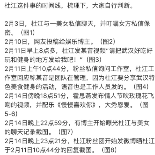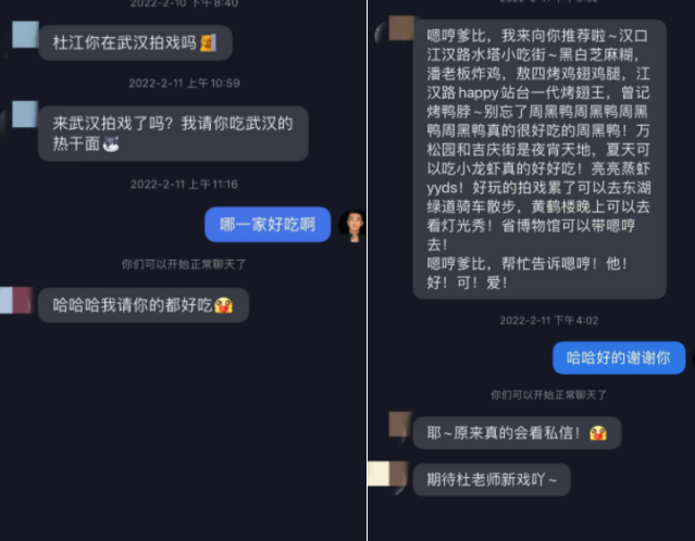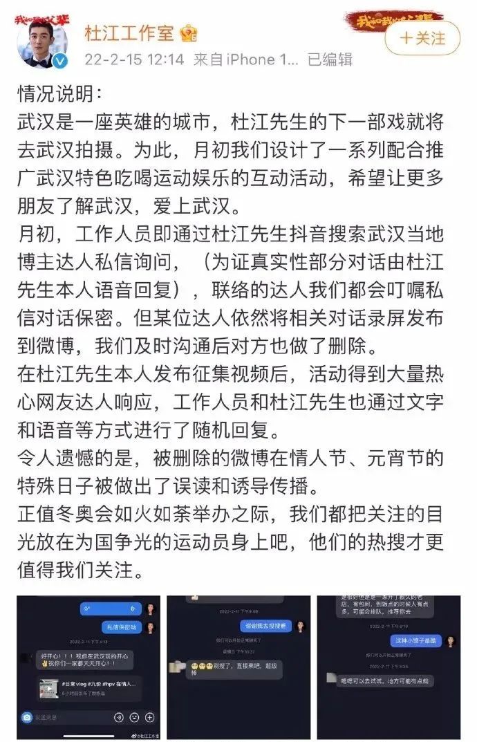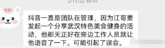 随后,杜江粉丝晒出了11日就去私信杜江工作室的聊天记录,工作室表示,该平台一直是团队在管理,因为杜江要发起一个分享武汉特色美食健身的活动,工作人员就让他语音了一下。