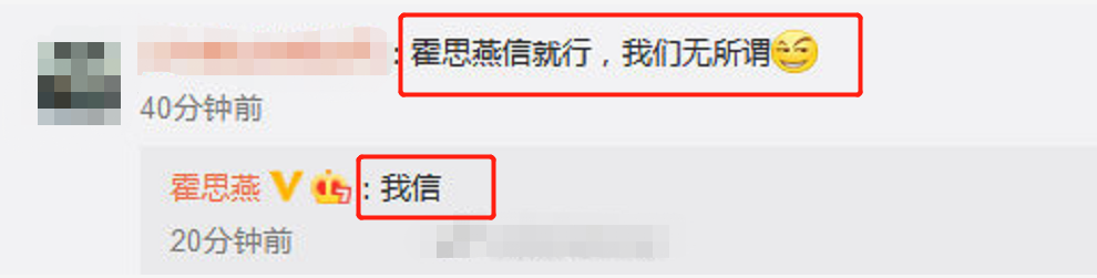 有网友评论说“霍思燕信就行,我们无所谓”,霍思燕则直接回复道:“我信”,力挺了丈夫。