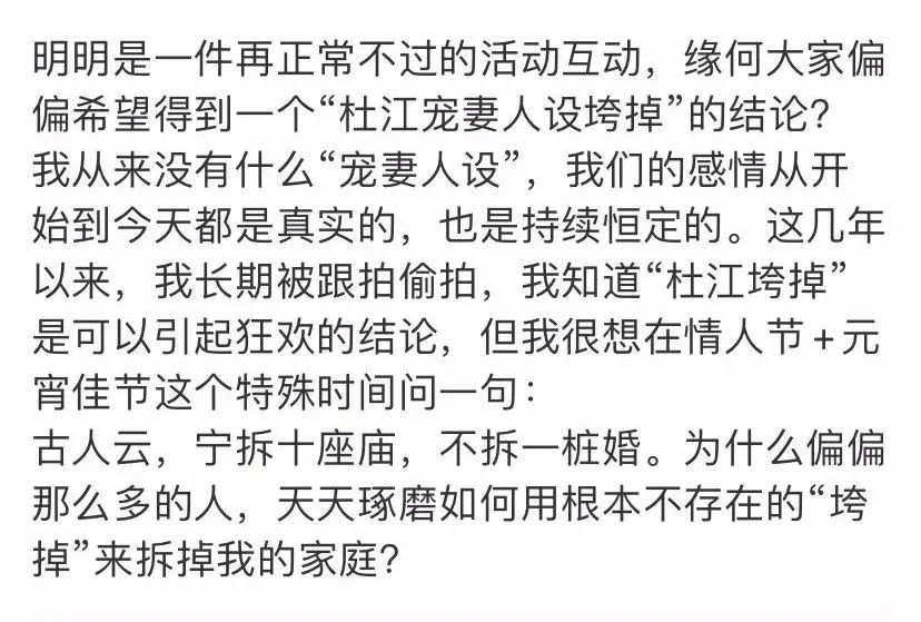 还特意针对自己的“宠妻人设”进行了回应,自己没有立人设,感情一直都是恒定真实的,而这几年自己被偷 拍,就是有人想看着“杜江垮掉”,并且指责造谣者想拆散自己的婚姻和家庭。