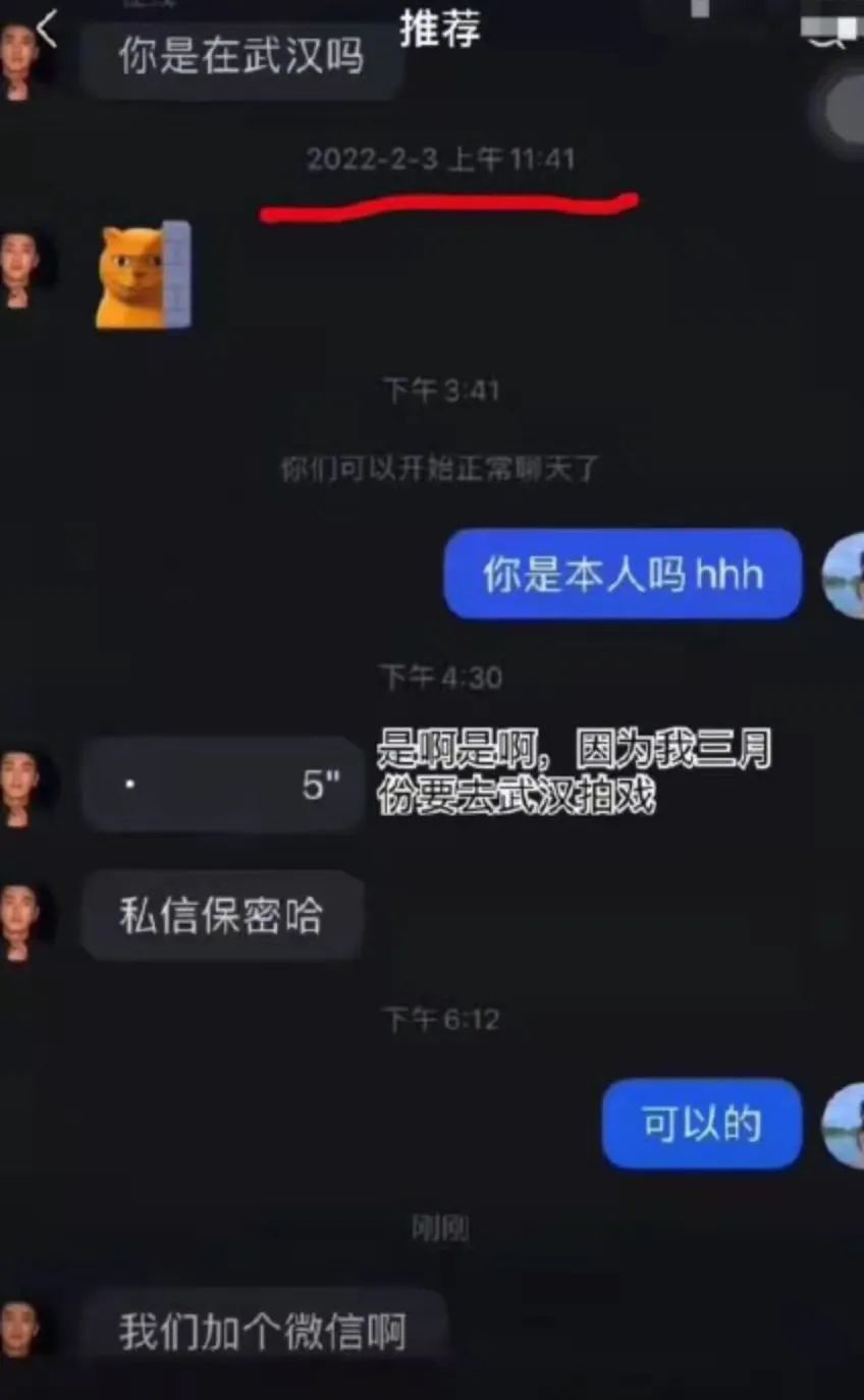 他说自己3月份要去武汉拍戏,要对方私信保密,同时要和对方加微信。