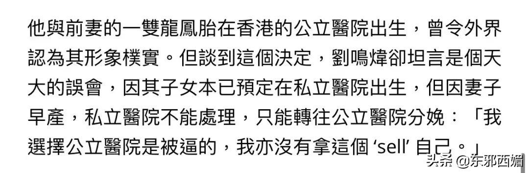 跟其他富豪承包私立医院的VIP病房不同,Wendy生孩子是在公立医院生产的。媒体当时报道他连老婆生孩子这事都要拿来营造自己低调朴实的人设,但刘鸣炜表示,这纯粹是个意外。