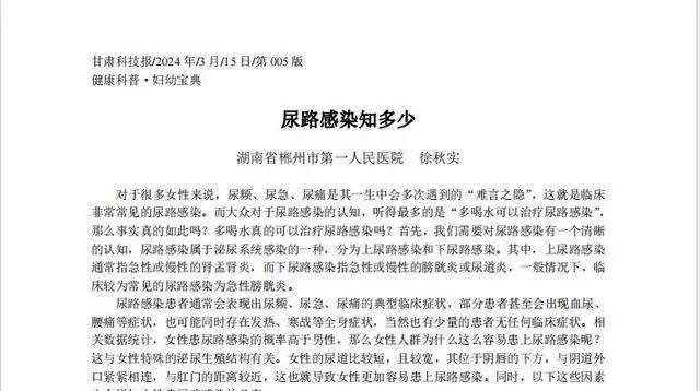 [1]徐秋实.尿路感染知多少[N].甘肃科技报,2024-03-15(005).