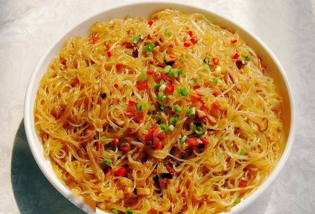 【材料】红薯粉丝1把、肉末100克、豆瓣1汤匙、生姜3片、蒜末1汤匙、葱花1汤匙、高汤4汤匙(约50毫升)、花椒1小把、干辣椒3条(切段)、老抽1汤匙、味精少许、花椒粉1茶匙