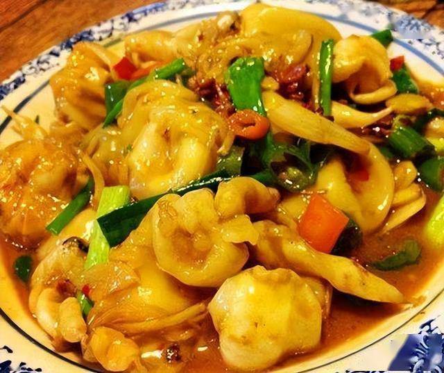4、将准备好的鱼泡倒入锅内大火继续翻炒(鱼泡一定要切开,不然下入油锅会爆开),鱼泡含有大量的胶原蛋白,所以在炒制的时候渗出一些黏液很正常