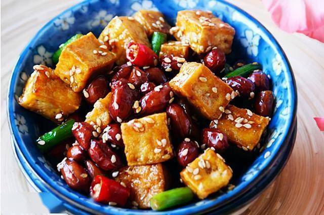1、花生米油炸熟备用;豆腐汆烫后切小丁,锅中放油烧热,下豆腐丁炸至金黄色捞出沥油备用