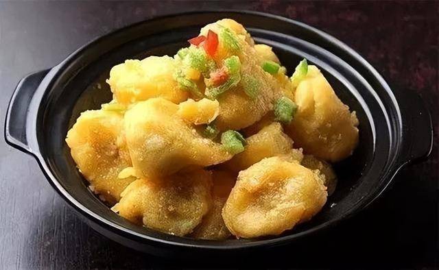 3、锅留底油烧热,放入咸蛋黄泥炒翻沙,再下香蕉块,加盐、鸡精和青红椒粒炒匀炒香,即可装在砂煲里上桌。