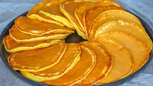 5、现在来烙饼,不粘锅不用刷油,这样做的松饼才能光滑且不油腻;烧热后用勺子舀一勺面糊淋在锅上,用中火烙,煎至一面出现许多大气泡,且感觉不会再有新的气泡出现时就给它翻个面,另一面稍微煎一下就可以出锅了;