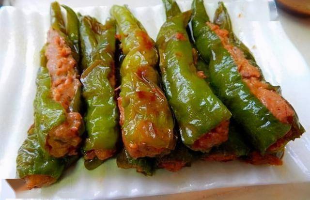 2.虎皮青椒洗净,用小刀挖去青椒里的籽,然后把肉馅酿入虎皮青椒中备用。