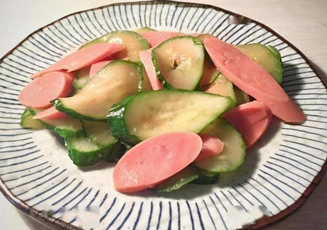 2.锅烧热倒油 油热后放入黄瓜大火翻炒 加盐、糖少许炒匀后倒入火腿肠翻炒片刻即可出锅;