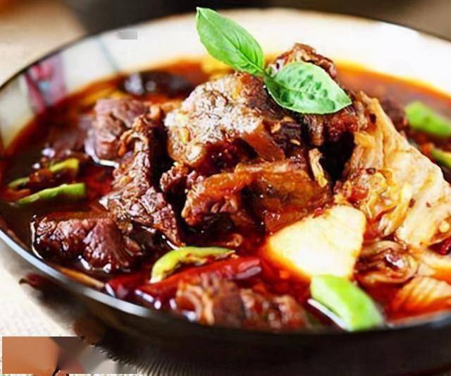 4、切好的牛腩放入锅内,继续炖煮约一小时,加入辣白菜,以后再煮十分钟,可适当加入辣椒、香菜、洋葱等。