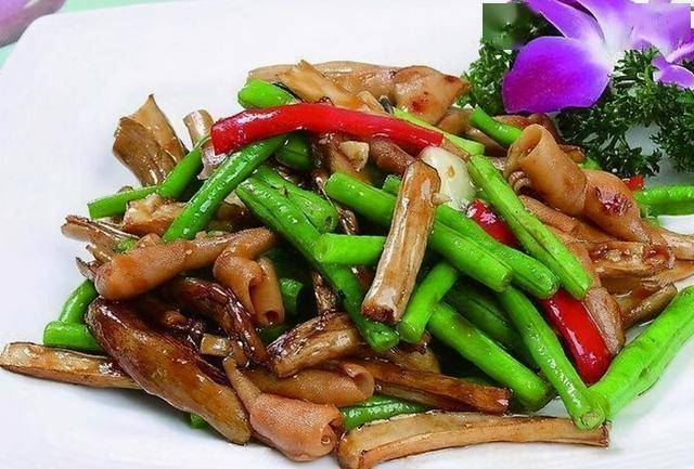 4、 锅留底油,放入蒜末煸香,倒入茶树菇、豆角炒匀。