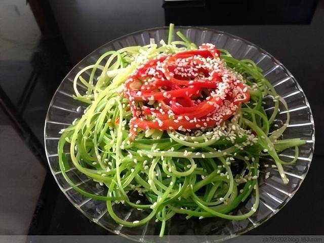 6.控干水后,从中间把蒜薹撕开,一根蒜薹可以分成四条,细点比较好。太长可以切两段或者三段。
