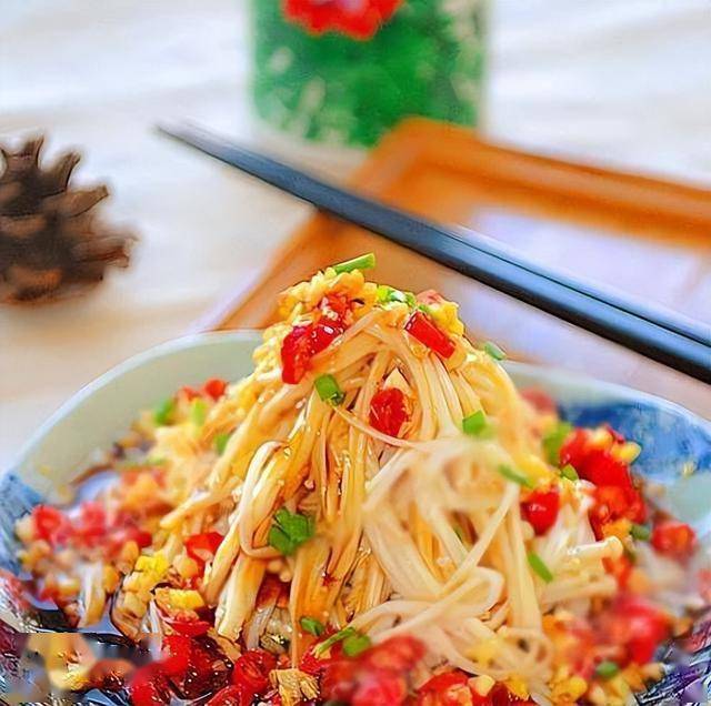 - 摆盘:可将金针菇卷成小束,用红椒丝点缀,提升颜值。