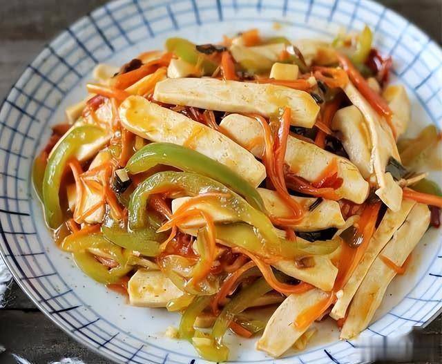 材料:白豆干、胡萝卜、大菜椒、辣豆瓣酱、醋、白糖、姜末、淀粉、葱末、油、盐。