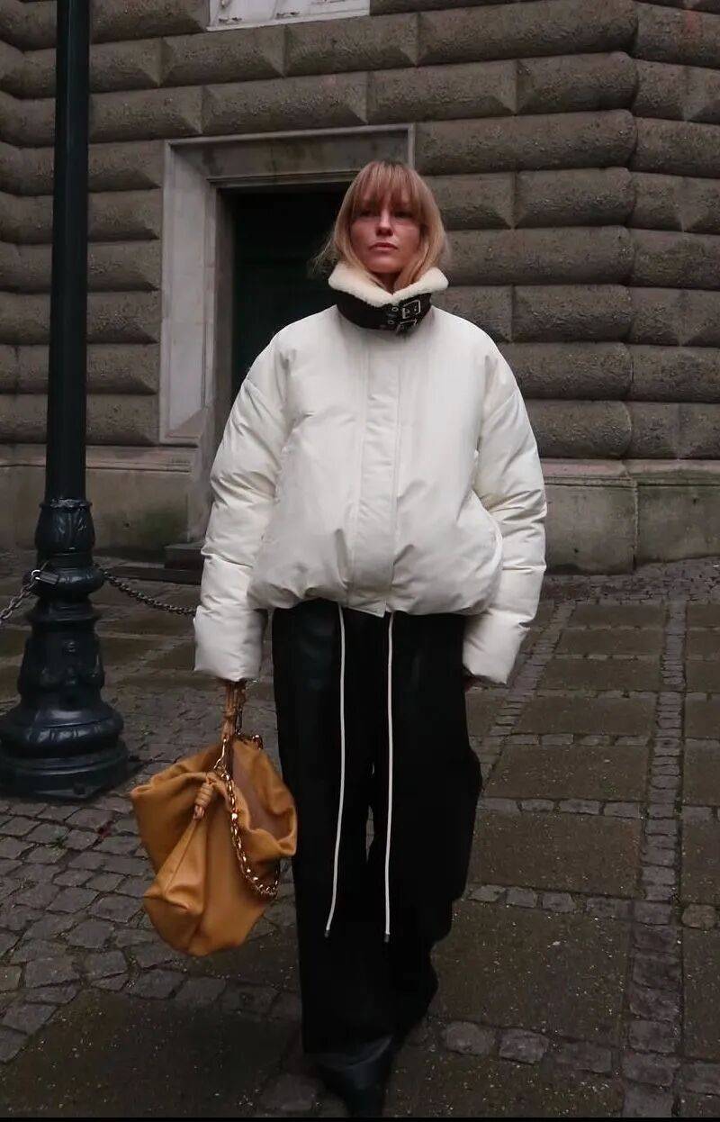 茧型羽绒服以弧形线条为核心。圆肩与收口下摆让轮廓保持包裹感,同时避免了臃肿。整体看似松散,却自带结构支撑。