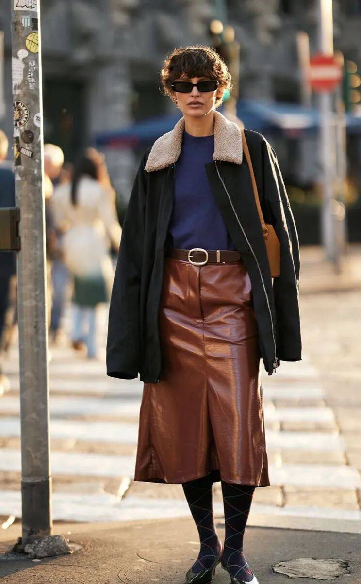 在搭配上,它适合与粗针织衫或牛仔裤组合,鞋履以皮靴为宜。上身的厚度与下身的利落形成视觉平衡,整体干净、简练。这种质感的稳重,让人看起来安定而松弛
