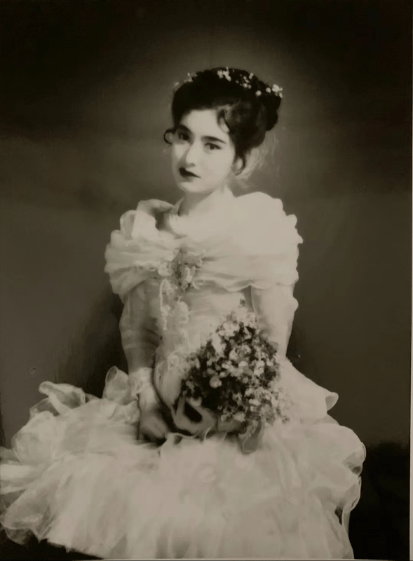 这张照片拍摄于1998年,是一张婚纱照。照片中的新娘穿着洁白的婚纱,手捧鲜花,清纯地望向镜头。她的眼睛里似乎隐藏着许多心事,仿佛在思考着自己即将开启的新生活。