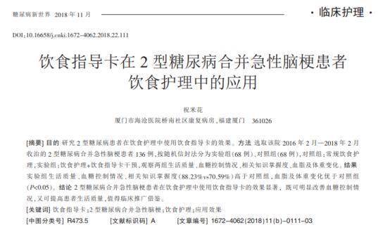 [1]祝米花.饮食指导卡在2型糖尿病合并急性脑梗患者饮食护理中的应用[J].糖尿病新世界,2018,