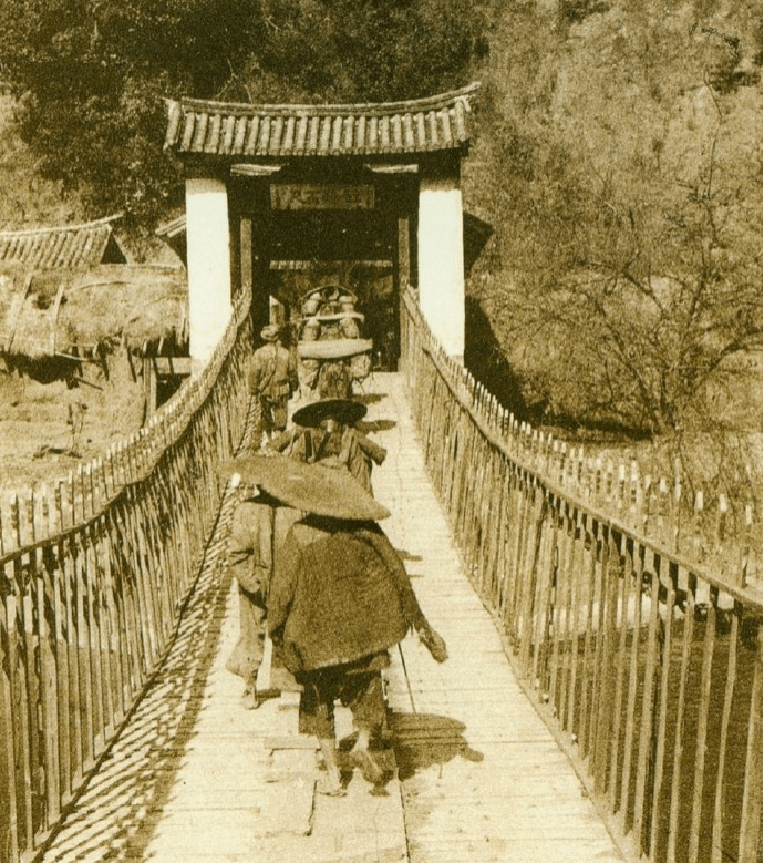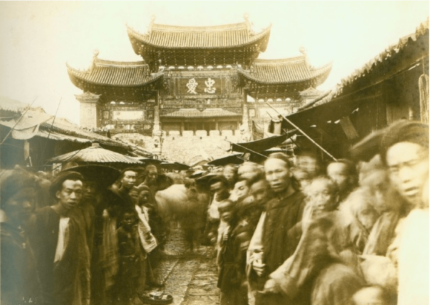 第二张照片拍摄的是晚清时期的一处集市。市场里人头攒动,热闹非凡。照片的左侧,一位戴着少数民族特有的斗笠,背着背篓的商贩引人注目。根据这些细节,可以推测这张照片拍摄的地点很可能是云南地区。