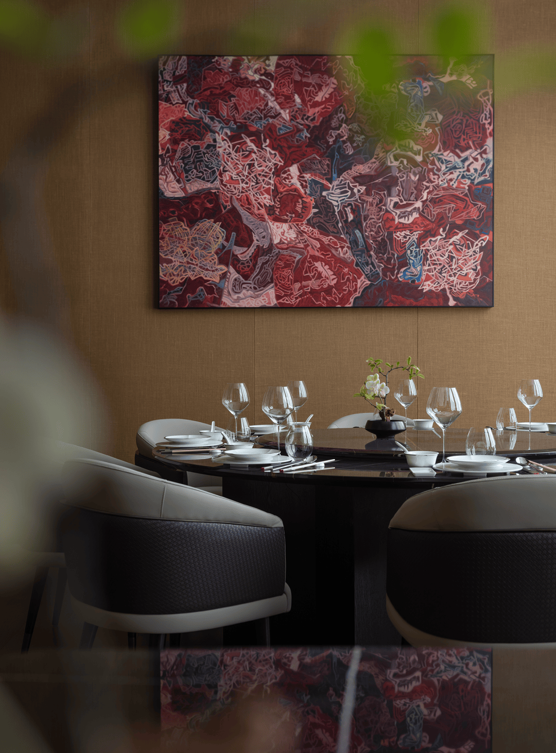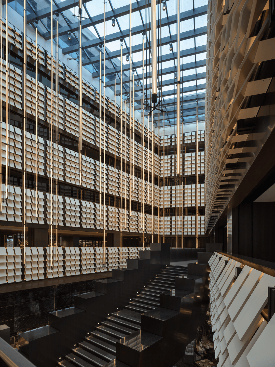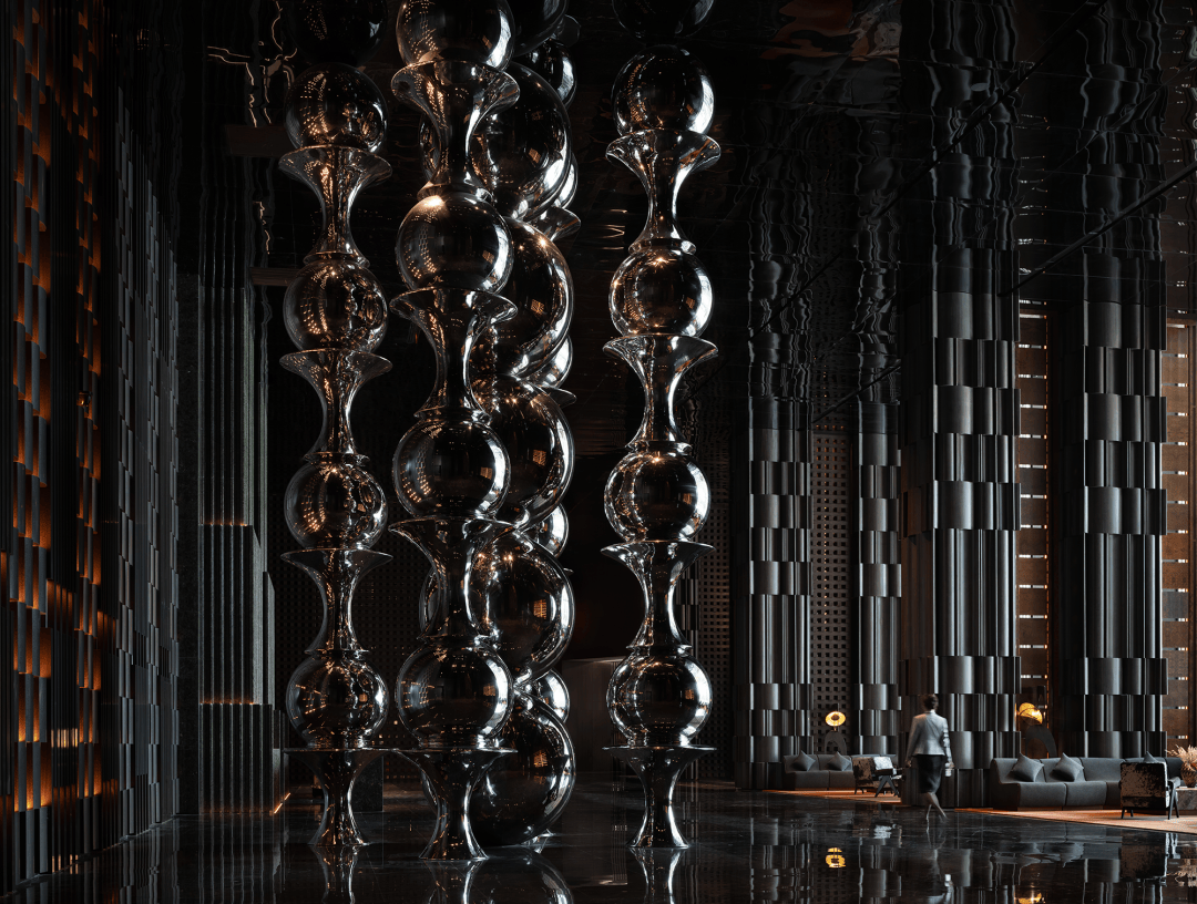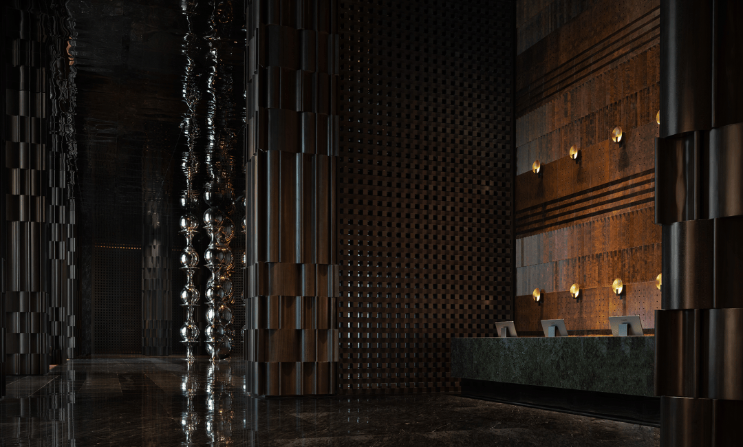 “远宏近秀”的设计概念随进入逐渐明晰。金属、石材、木饰、织物等等构建起一座巨型圣殿,其氛围并非来自昂贵的材料,而是源于材料被放置和感知的方式。空间的质量、光的层次、寂静的声响——这些成为塑造体验的根本。