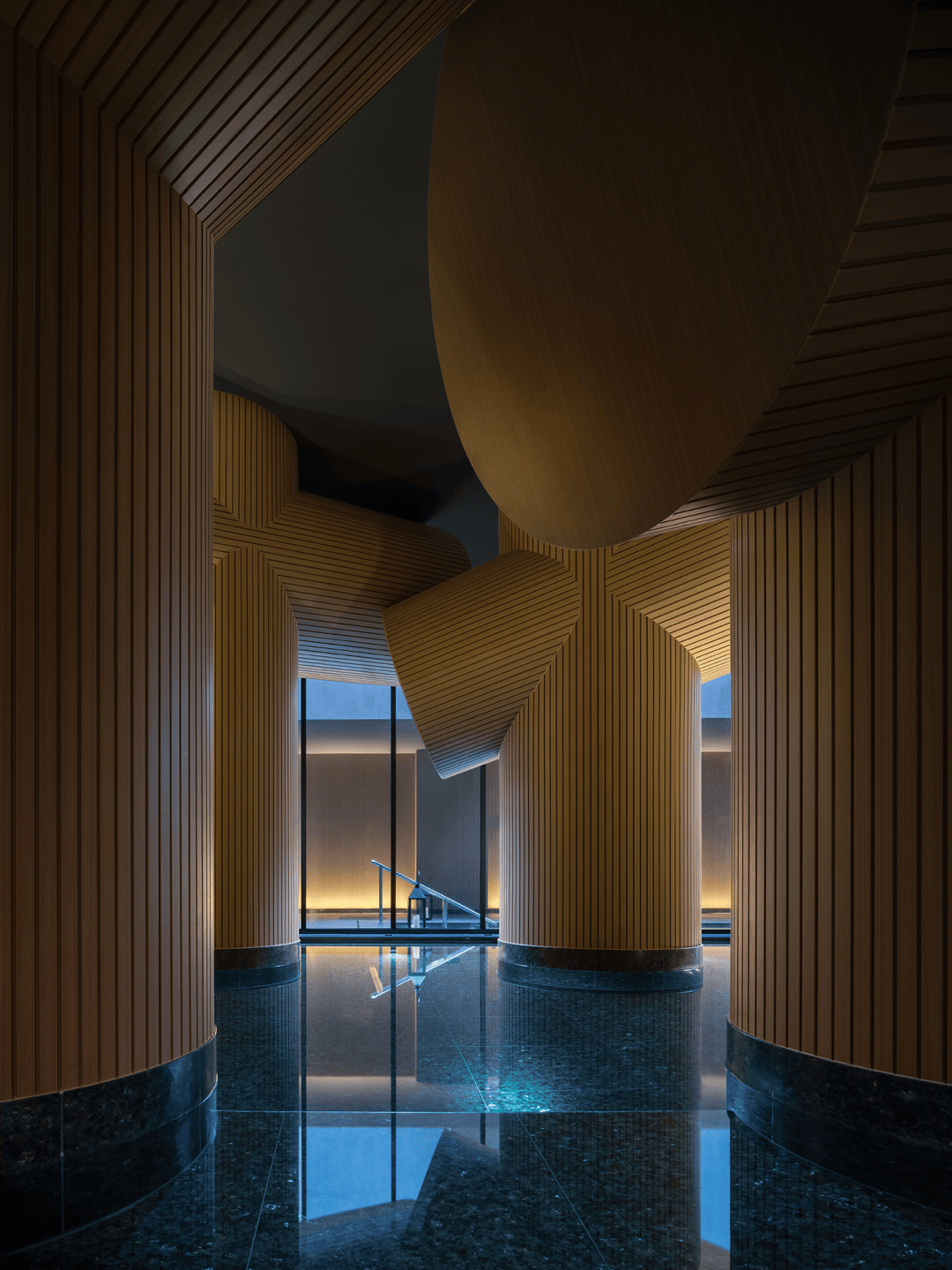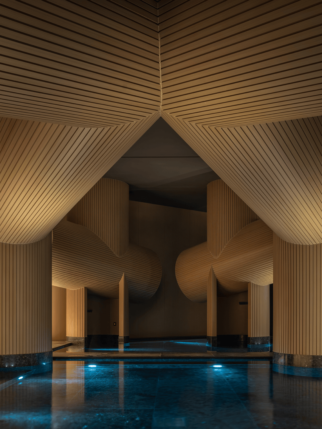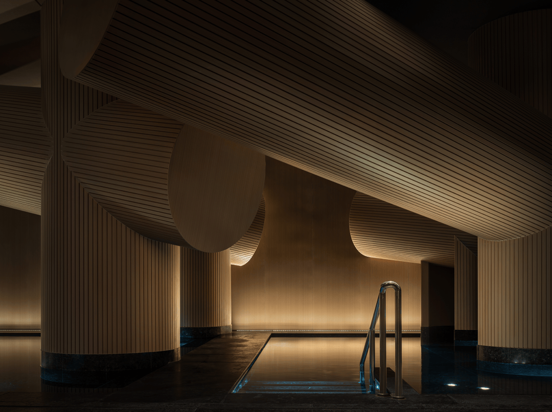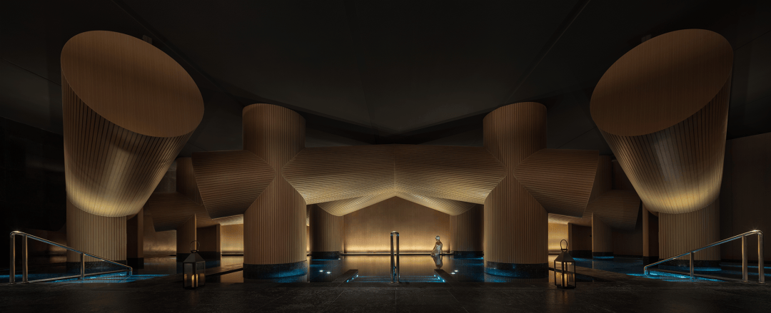 与以往将水区视为功能配套的逻辑不同,星河云谷的水被赋予叙事主权。水区内,巨柱在垂直方向与天花穿插互构,形成有力而温柔的包裹,使人再度体验回归母体的安宁洁净。水的流动、侵蚀和不断滴落也让建筑像液体一样流动。