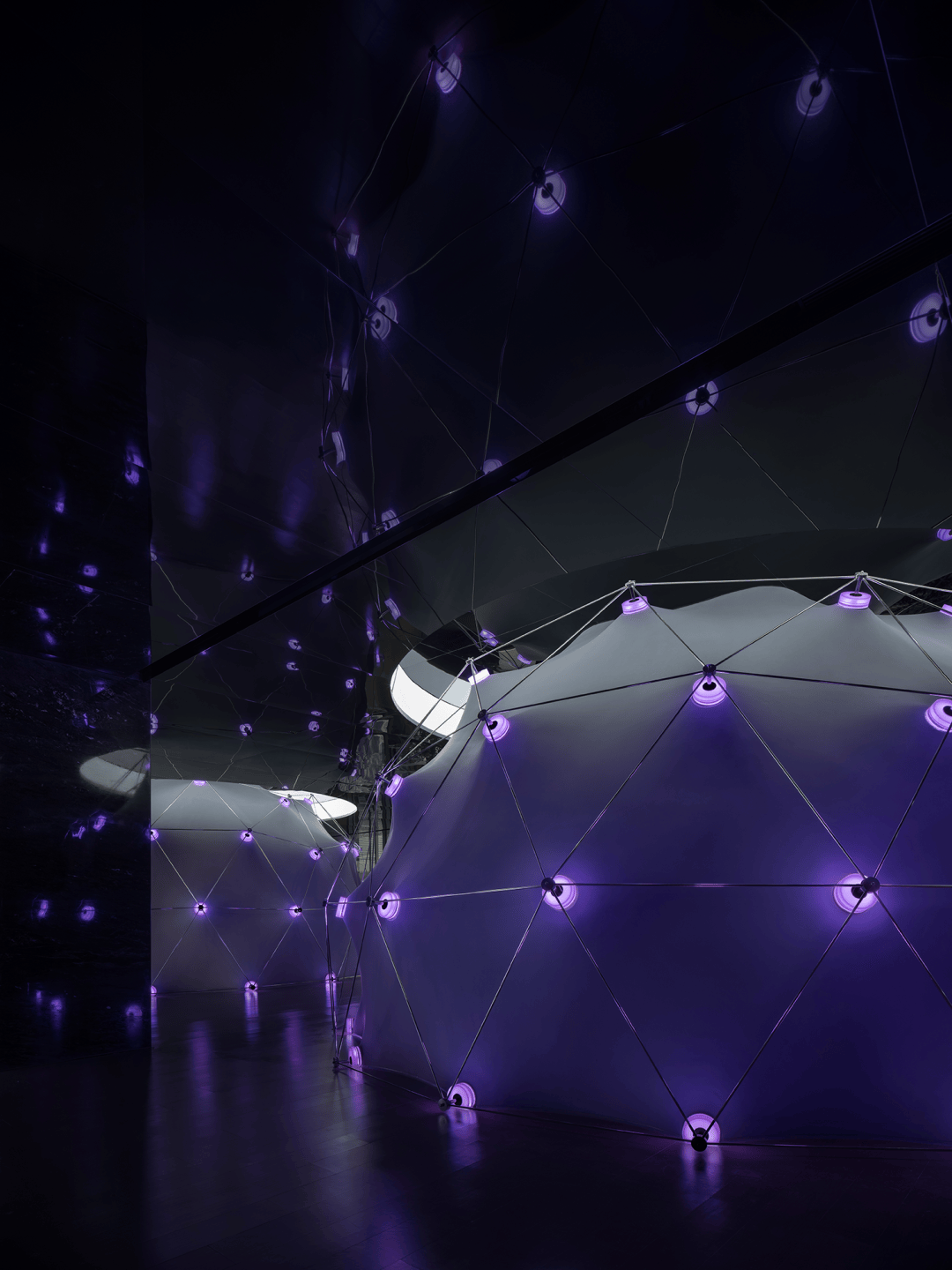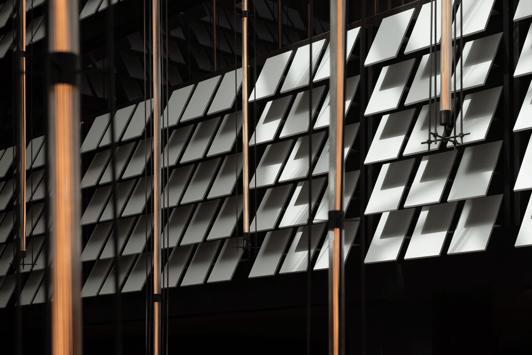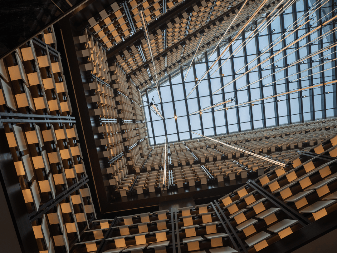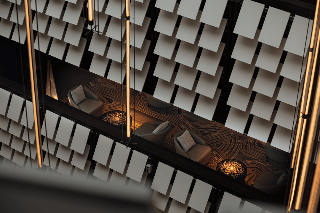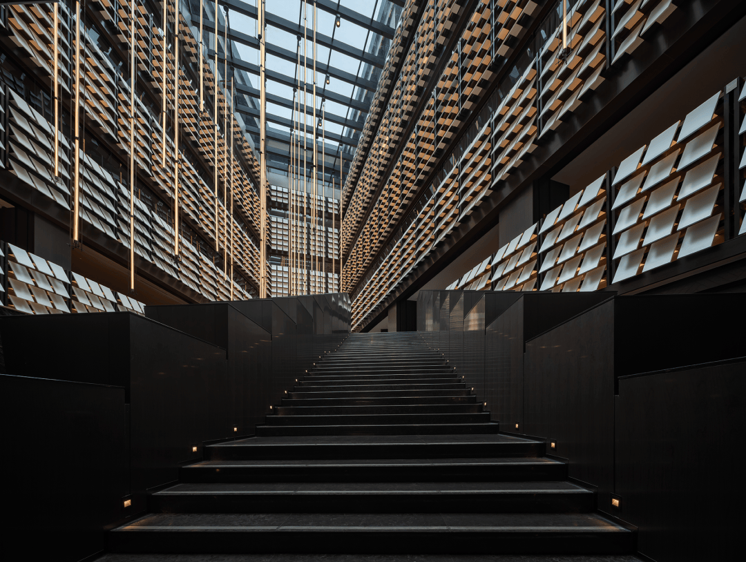 尽管星河云谷由现代材料建造,但从大堂开始,所有的公共空间仍不可避免地让人感觉置身时间旷野之外——地质、土壤、宇宙、粒子、声光似乎在宏伟的不断翻转闪烁的腔体内部混合,不断冲击人们的感知,这些是设计刻意为之的部分。