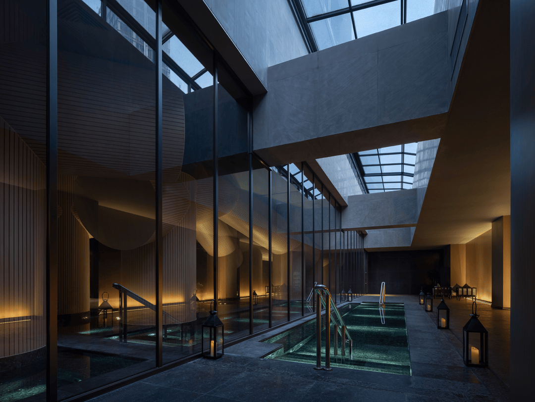 值得玩味的是提供共浴公共泡池,丰富的体验层次精准回应了现代东方人对度假生活的复杂期待——偶尔独处,常常联结。进入可男女共浴的公共泡池,建筑切割天幕,温柔转化为一种中性的宁静,水与光共同创造的反射与透明性将天空引入水中,也将建筑体量“溶解”。水汽氤氲弥漫,建筑创造出宁静的听觉体验,那是一种有回应的,能唤醒记忆和深层放松的寂静。
