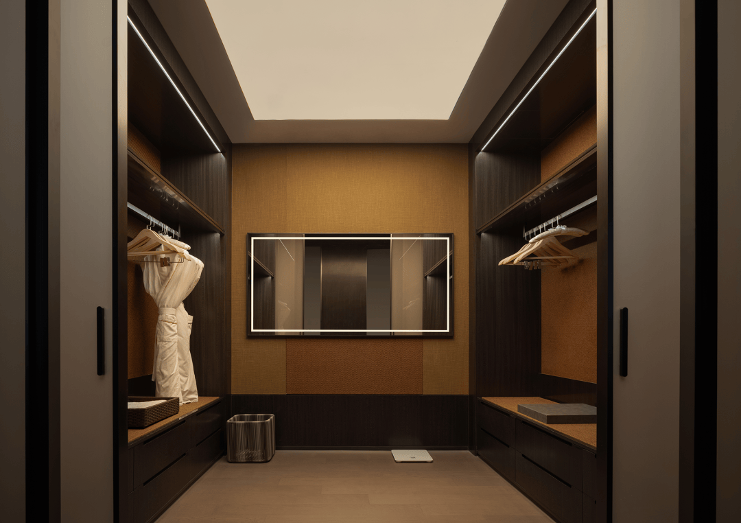 在满足建筑策划、功能和体验舒适需求的同时,设计师始终让空间保持着一种显著的疏离、抵抗和张力感。这种难以探测的神秘感,一次又一次地激发着客人的想象和热情。在恢弘的统一之下,是随着镜头推进后层叠的、近乎繁复的细部处理,触感、听觉、嗅觉逐一被调动,让人想起普鲁斯特“对家中温暖的回忆温柔地暖和着我冻僵的四肢,家和感官的愉悦化为同一种感觉。”