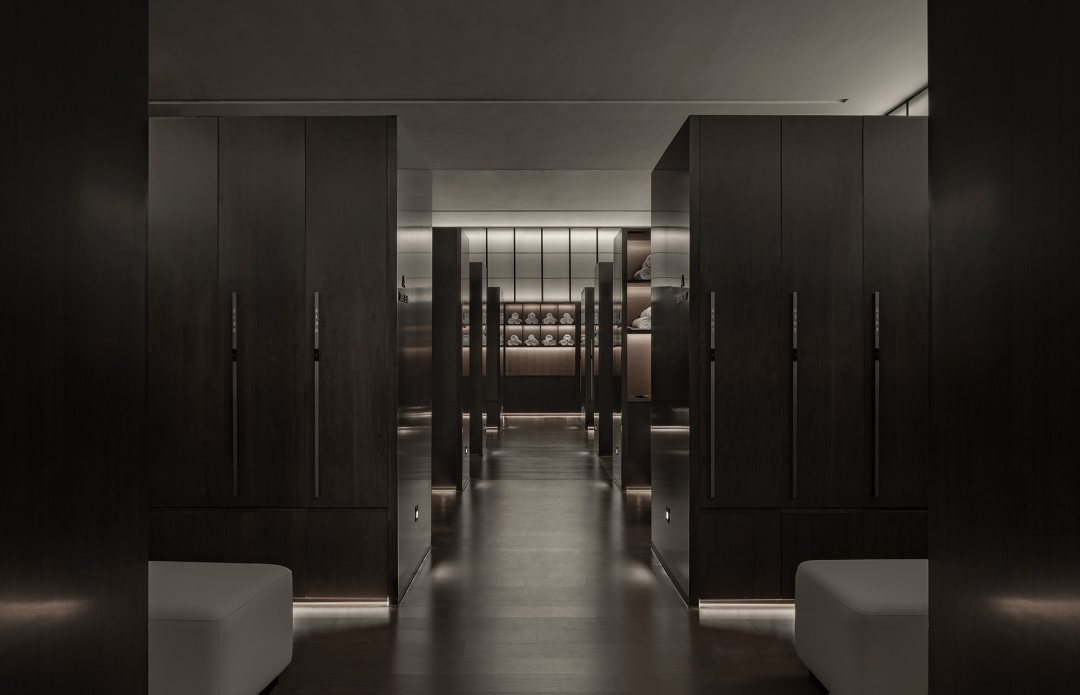 水区配套功能空间传达出审慎的理性。淋浴区、更衣区及助浴区在洁净的木色与灰色基调下,释放出极致简单下的洁净和未来感。