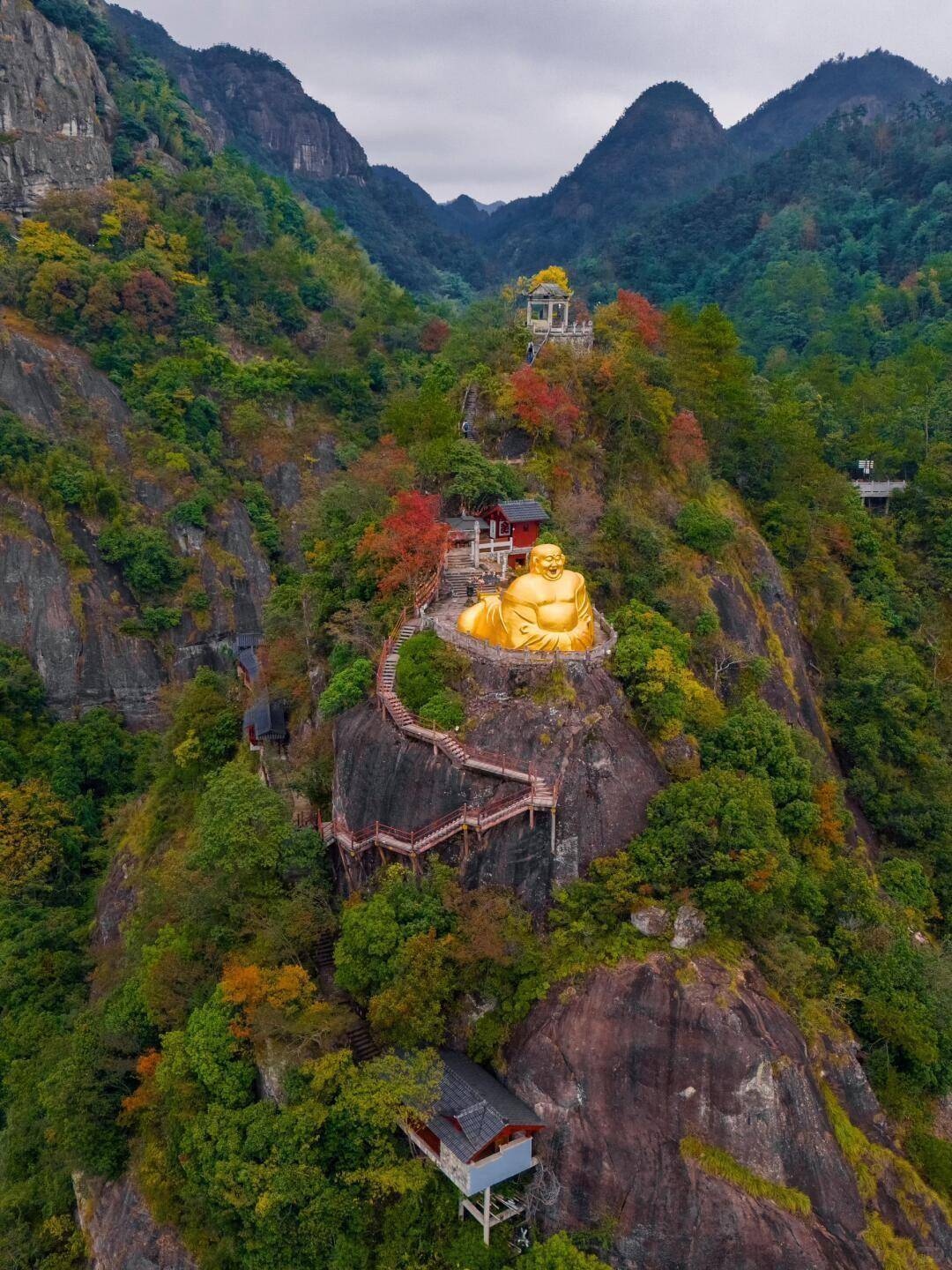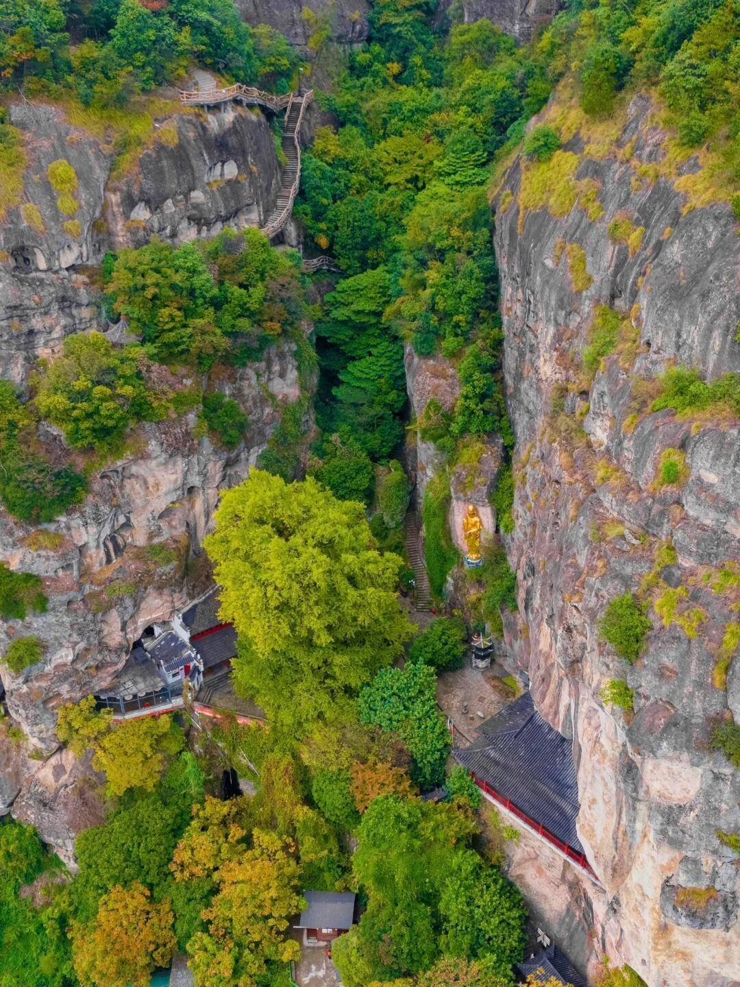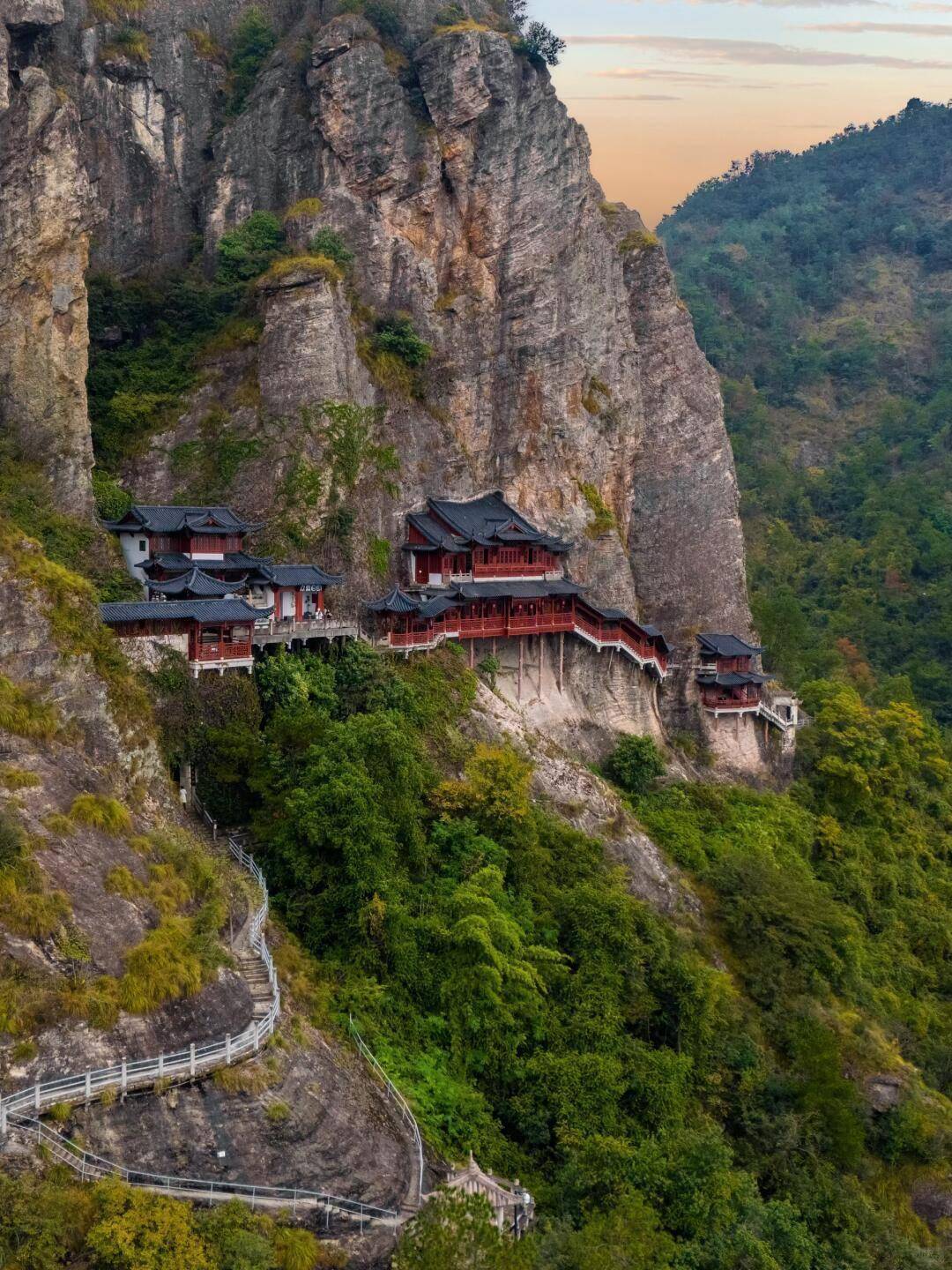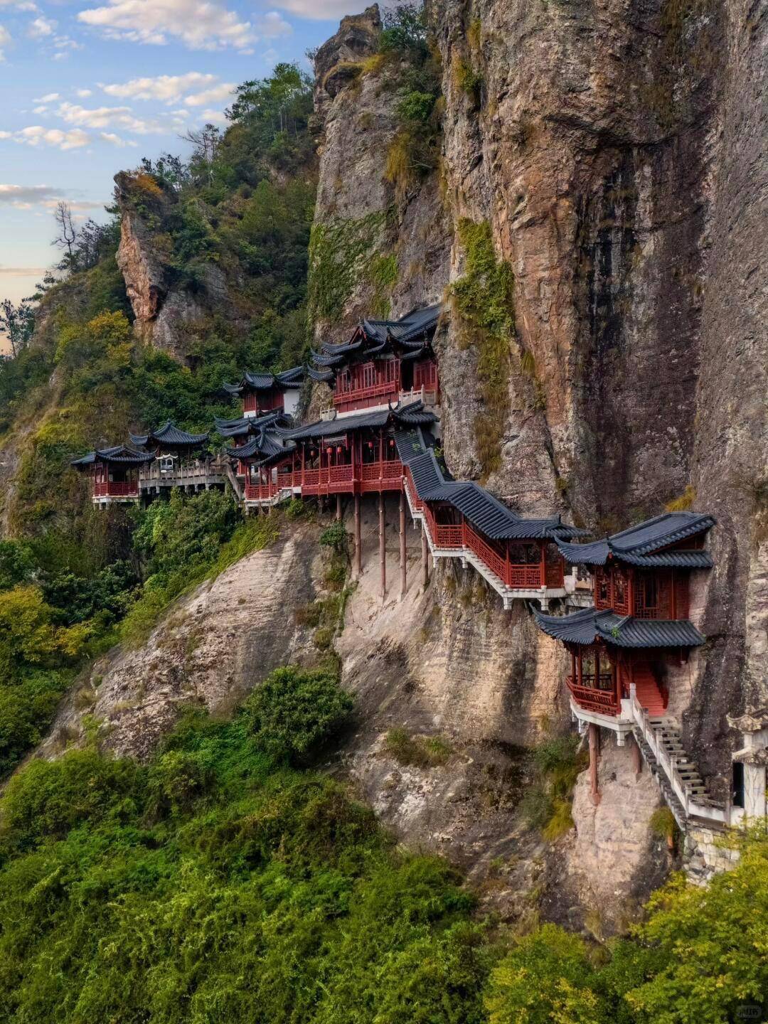 开始爬山。栈道贴着崖壁,木头踩上去有实心的敦厚感。越往上,风越大,带着湿润的云气扑在脸上。然后,那座“江南悬空寺”就撞进了眼里——它不像山西悬空寺那般全然凌空,而是一半深深嵌进赭色的山岩里,另一半由无数木柱支撑着,探向虚空。走在寺旁的悬廊上,扶栏下望,山谷深不见底,心跳不由漏了一拍。恰巧一阵云雾漫过,殿角的铜铃在雾中轻响,那一瞬间,真觉得自己不是游客,倒像个误入秘境的方外之人。