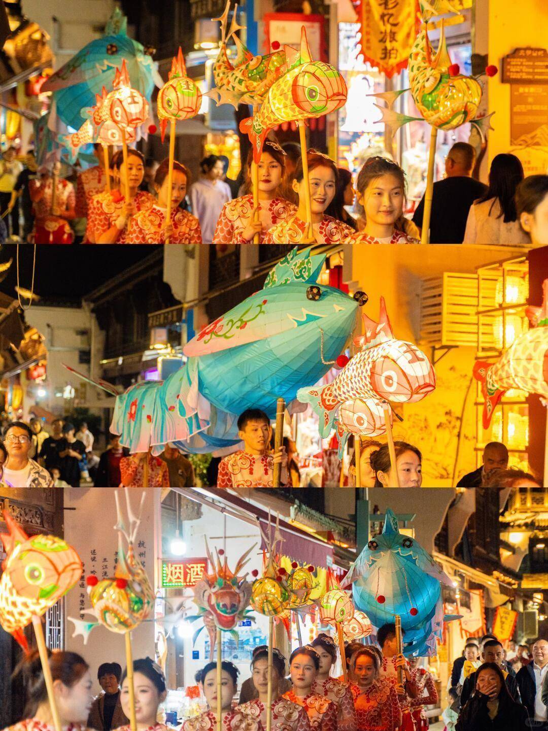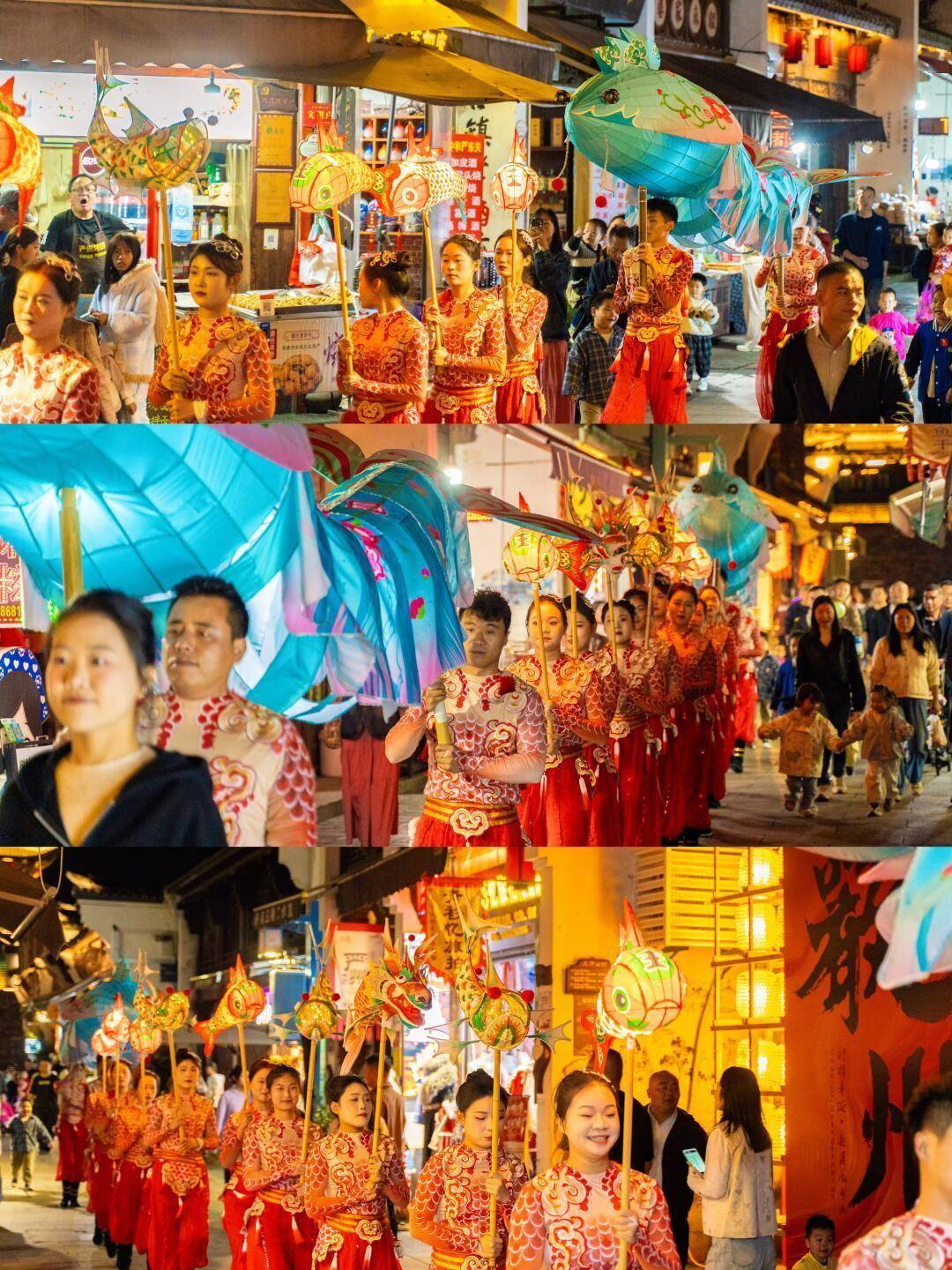 华灯初上时,古城换了一副模样 。灯笼一串串亮起来,暖黄的光晕染在石板路上。我在宋家湖畔等摇橹船,船上挂着花灯,有身着宋装的女子在船头翩然起舞,水影灯影人影交织,美得不真实。沿着主街溜达,忽然一阵锣鼓响,虾灯巡游的队伍热热闹闹地来了,那用竹篾扎成的大虾灵动活泼,引得孩子们追着跑,笑声能把夜色点燃。