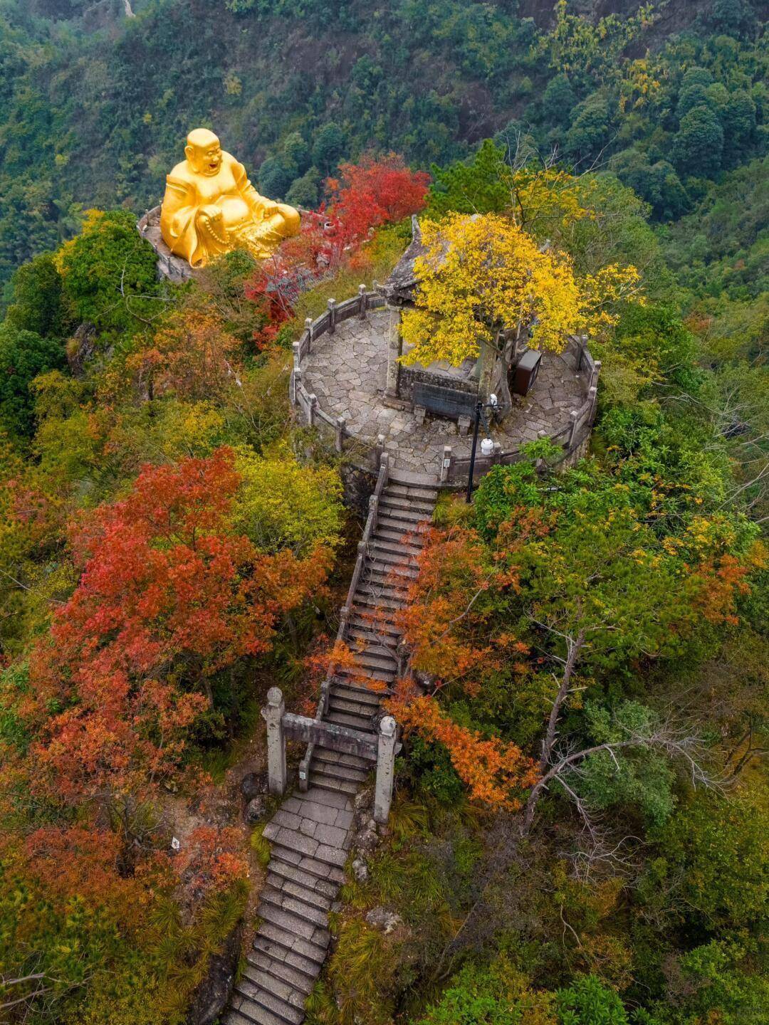 不过,山顶的双面佛和千年银杏,才是我这趟登山的高潮。深秋的银杏叶正黄到极致,像把积蓄了一整年的阳光都熔成了金片,簌簌落在古老的禅院地上。踩上去沙沙的响,那声音干净极了。站在树下抬头看,天光被枝叶滤成碎金,那一刻的禅意,无需言语。